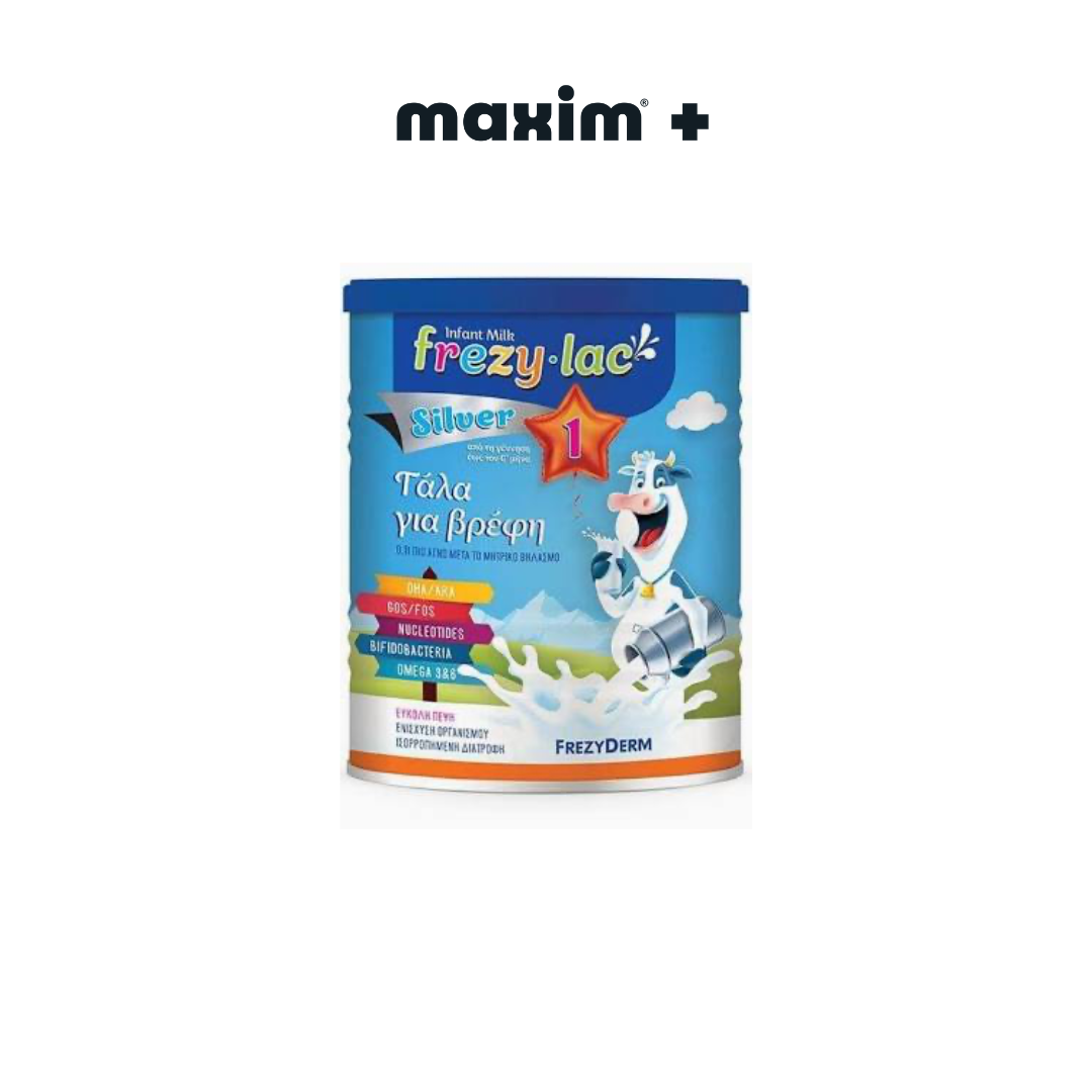 Το FREZYLAC SILVER 1 είναι αγελαδινό γάλα σε σκόνη, κατάλληλο για τη διατροφή του τελειόμηνου βρέφους από τη γέννηση έως τον 6° μήνα. Βασισμένο στους Κανονισμούς της Ε.Ε. που διέπουν τα παρασκευάσματα για βρέφη και τα παρασκευάσματα δεύτερης βρεφικής ηλικίας.