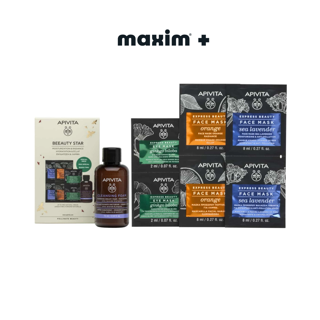 Apivita Set Beauty Star Face Mask Sea Lavender 2x8ml + Face Mask Orange 2x8ml + Eye Mask Gingko Biloba 2x2ml + Cleansing Foam 75ml