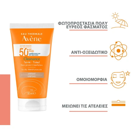 Η Avene Cleanance Solaire Teintee SPF50+ είναι μια αντηλιακή κρέμα προσώπου με χρώμα, ειδικά σχεδιασμένη για λιπαρό και με τάση ακμής δέρμα. Προσφέρει πολύ υψηλή προστασία UVA/UVB χάρη στο σύστημα φίλτρων SunSitive®, ενώ ταυτόχρονα ρυθμίζει τη λιπαρότητα και ματάρει την επιδερμίδα χωρίς να τη βαραίνει.