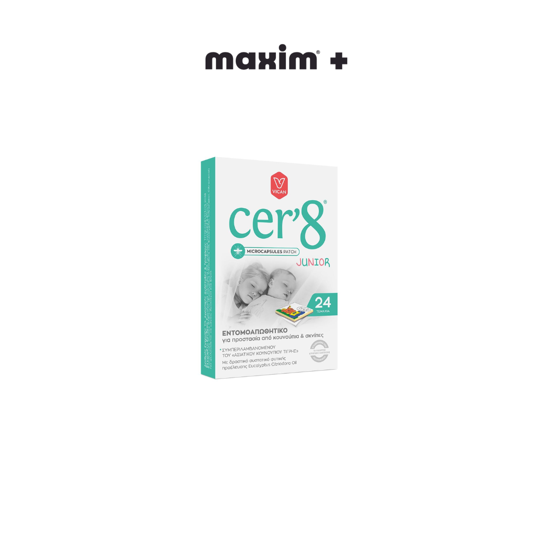 Τα Cer'8 Junior Παιδικά Αντικουνουπικά Αυτοκόλλητα με Μικροκάψουλες (24 τεμάχια) είναι μια φυσική, πρακτική και ασφαλής λύση προστασίας από τα κουνούπια, ειδικά σχεδιασμένη για βρέφη και μικρά παιδιά.