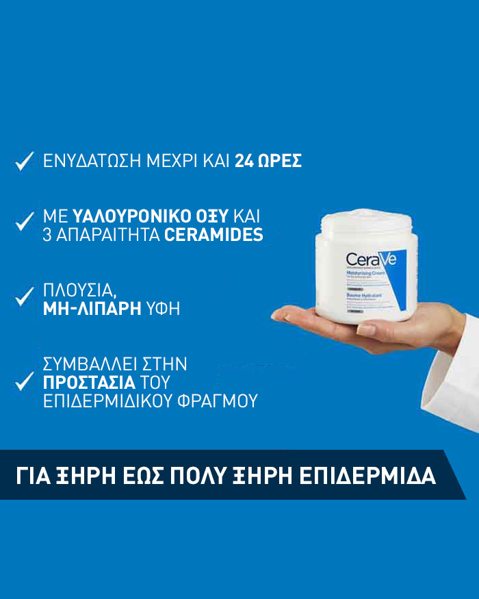 Η CeraVe Moisturizing Cream είναι μια πλούσια ενυδατική κρέμα για πρόσωπο και σώμα, ειδικά σχεδιασμένη για να παρέχει βαθιά και μακράς διάρκειας ενυδάτωση. Η σύνθεσή της με 3 απαραίτητα ceramides και υαλουρονικό οξύ βοηθά στην αποκατάσταση και ενίσχυση του φυσικού δερματικού φραγμού, προστατεύοντας το δέρμα από την ξηρότητα και αποτρέποντας την απώλεια υγρασίας.