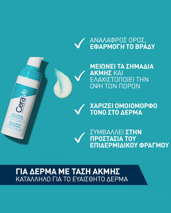 Ο CeraVe Resurfacing Retinol Serum είναι ένας προηγμένος ορός προσώπου με ρετινόλη, ειδικά σχεδιασμένος για τη μείωση των σημαδιών ακμής, των δυσχρωμιών και του ανομοιόμορφου τόνου της επιδερμίδας.