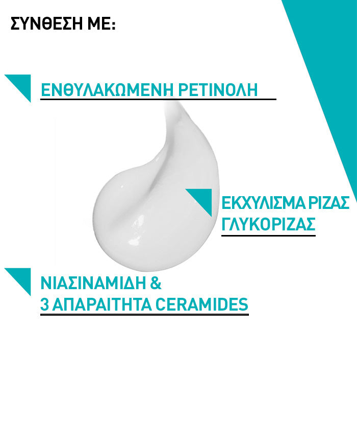 Η σύνθεσή του περιέχει ενθυλακωμένη ρετινόλη, που απελευθερώνεται σταδιακά για μέγιστη αποτελεσματικότητα με ελάχιστο ερεθισμό. Σε συνδυασμό με νιασιναμίδη και τρεις απαραίτητες κεραμίδες, ενισχύει τη φυσική ανανέωση του δέρματος και αποκαθιστά τον προστατευτικό του φραγμό.