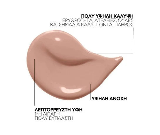Η λεπτόρρευστη, μη λιπαρή υφή του επιτρέπει την εφαρμογή σε πολλαπλές στρώσεις, προσφέροντας προσαρμόσιμη κάλυψη χωρίς να βαραίνει την επιδερμίδα. Καλύπτει αποτελεσματικά ερυθρότητα, ουλές, σημάδια και ατέλειες, προσφέροντας φυσικό και ομοιόμορφο αποτέλεσμα που διαρκεί έως και 16 ώρες .