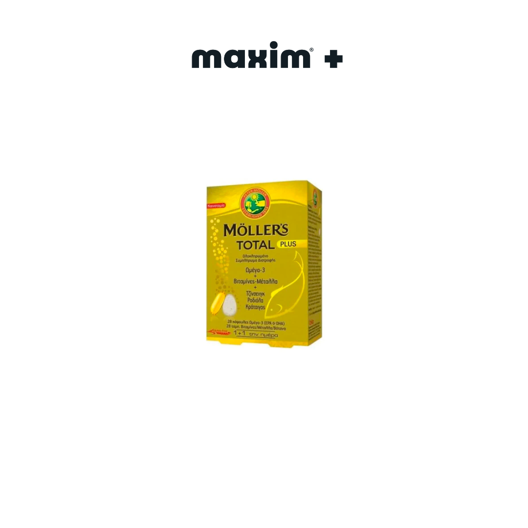 Το Moller's Total Plus είναι ένα πολυβιταμινούχο συμπλήρωμα διατροφής που περιέχει βιταμίνες, μέταλλα και βότανα, σε συνδυασμό με ωμέγα 3 λιπαρά οξέα. Αποτελεί παρόμοια φόρμουλα με το Mollers Total, με διαφορά την προσθήκη 3 βοτάνων (κράταιγο, ροδιόλα, panax ginseng). Περιέχει επίσης πολύ λιγότερο ιώδιο (22.5 μg) που το καθιστά συμβατό με φάρμακα για το θυρεοειδή. Είναι κατάλληλο για * :