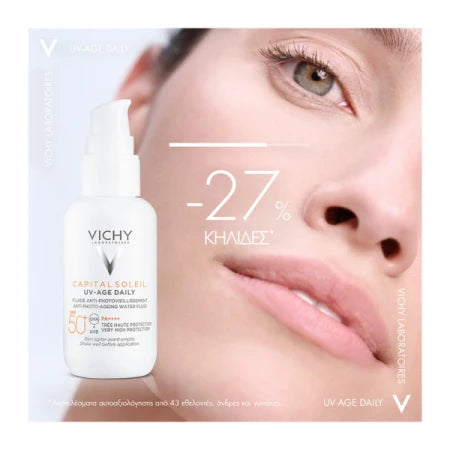 Το Vichy Capital Soleil UV-Age Daily SPF50+ Water Fluid (40ml) είναι ένα προηγμένο αντηλιακό προσώπου που συνδυάζει αντηλιακή προστασία και αντιγηραντική φροντίδα σε μία κίνηση. Η λεπτόρρευστη υφή του προσφέρει πολύ υψηλή προστασία UVA/UVB και είναι ιδανικό για καθημερινή χρήση και πρόληψη των σημαδιών φωτογήρανσης.