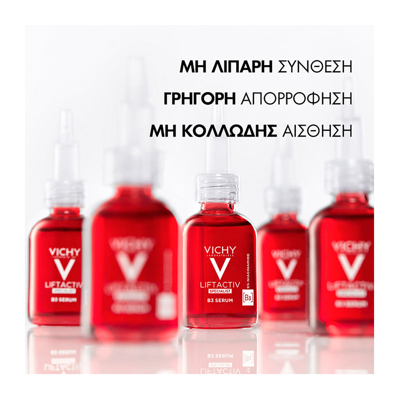 Ο Vichy Liftactiv Pigment B3 Serum είναι ένας προηγμένος ορός προσώπου, ειδικά σχεδιασμένος για να καταπολεμά όλους τους τύπους κηλίδων και τον ανομοιόμορφο χρωματικό τόνο. Με μια ισχυρή σύνθεση που περιλαμβάνει 5% Νιασιναμίδη (Βιταμίνη B3), Γλυκολικό Οξύ, Βιταμίνη Cg και το καινοτόμο σύμπλεγμα MELASYL, προσφέρει ορατά αποτελέσματα σε μόλις 8 εβδομάδες χρήσης, μειώνοντας τις καφέ κηλίδες, τις δυσχρωμίες, τις ρυτίδες και ενισχύοντας τη φωτεινότητα και την ομοιομορφία της επιδερμίδας.