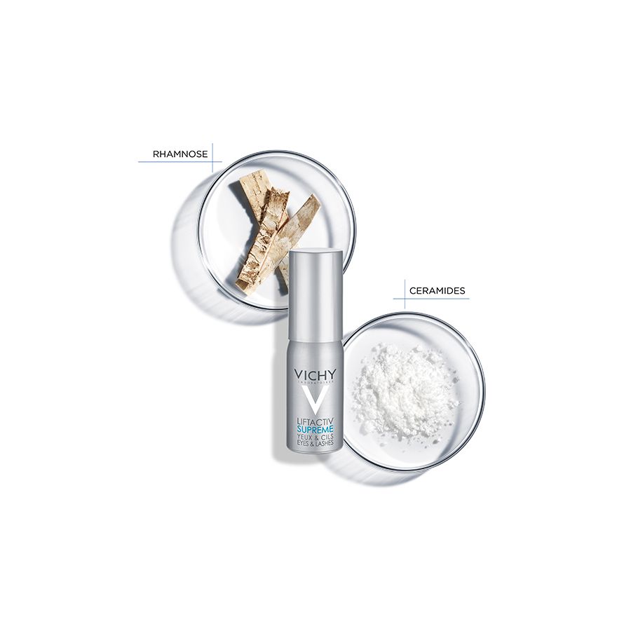 Το Vichy Liftactiv Serum 10 Eyes & Lashes 15ml είναι ένας διπλής δράσης αντιγηραντικός ορός, σχεδιασμένος ειδικά για την ευαίσθητη περιοχή των ματιών αλλά και για τις βλεφαρίδες. Η καινοτόμα σύνθεσή του περιλαμβάνει ραμνόζη, υαλουρονικό οξύ, κεραμίδια, καθώς και 15 μεταλλικά στοιχεία από το Ιαματικό Νερό της Vichy, προσφέροντας ενυδάτωση, σύσφιξη και ενίσχυση των βλεφαρίδων.