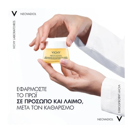 Οδηγίες χρήσης: Εφαρμόστε το πρωί σε καθαρό πρόσωπο και λαιμό, αποφεύγοντας την περιοχή γύρω από τα μάτια. Για βέλτιστα αποτελέσματα, συνιστάται η χρήση της σε συνδυασμό με το Vichy Neovadiol Meno 5 Bi-Serum και την Vichy Neovadiol Κρέμα Νύχτας.